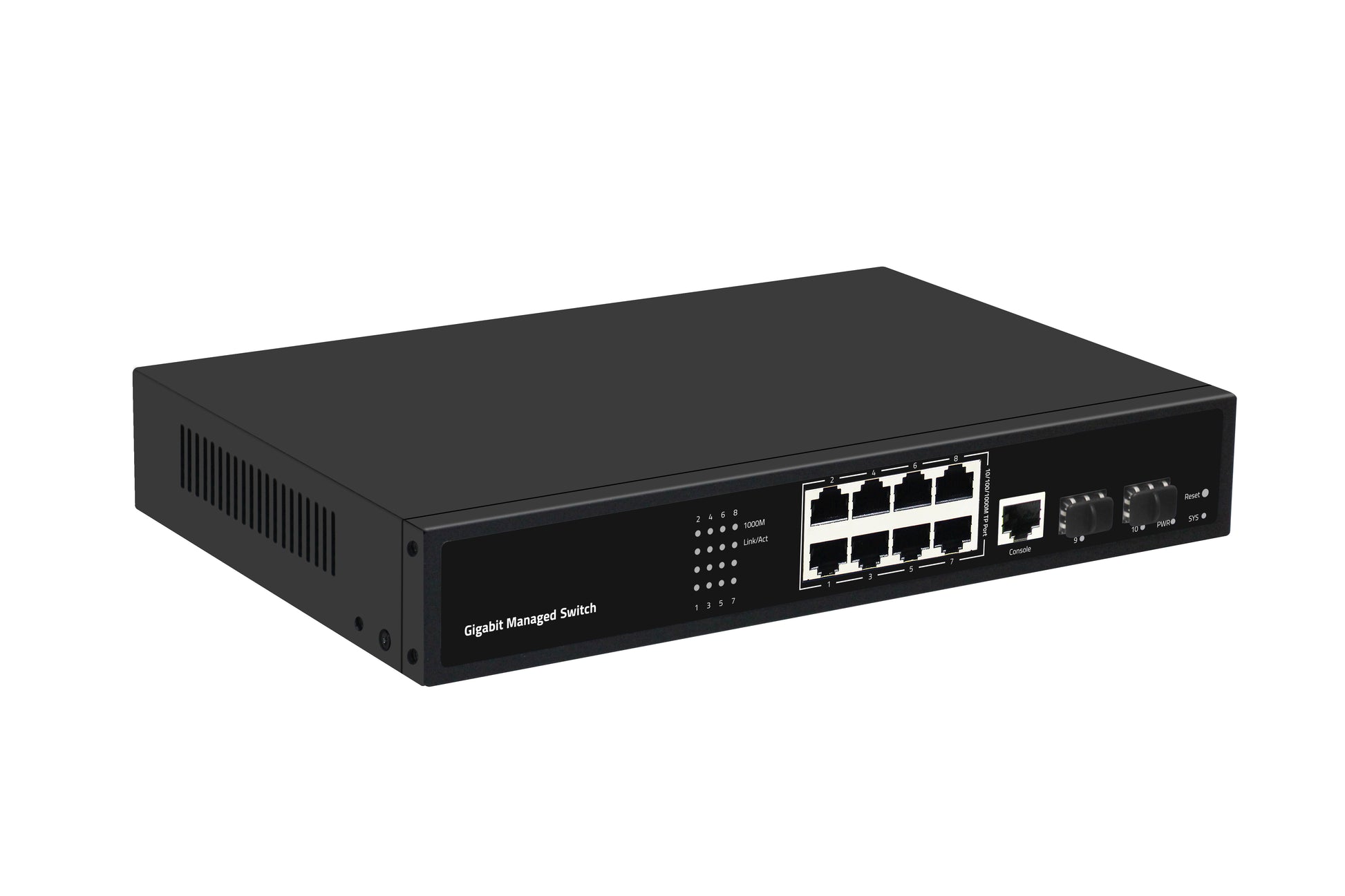 8× 10/100/1000Mbps auto-sensing RJ45 ports + 2× 1G SFP fiber uplinks + 1 console port