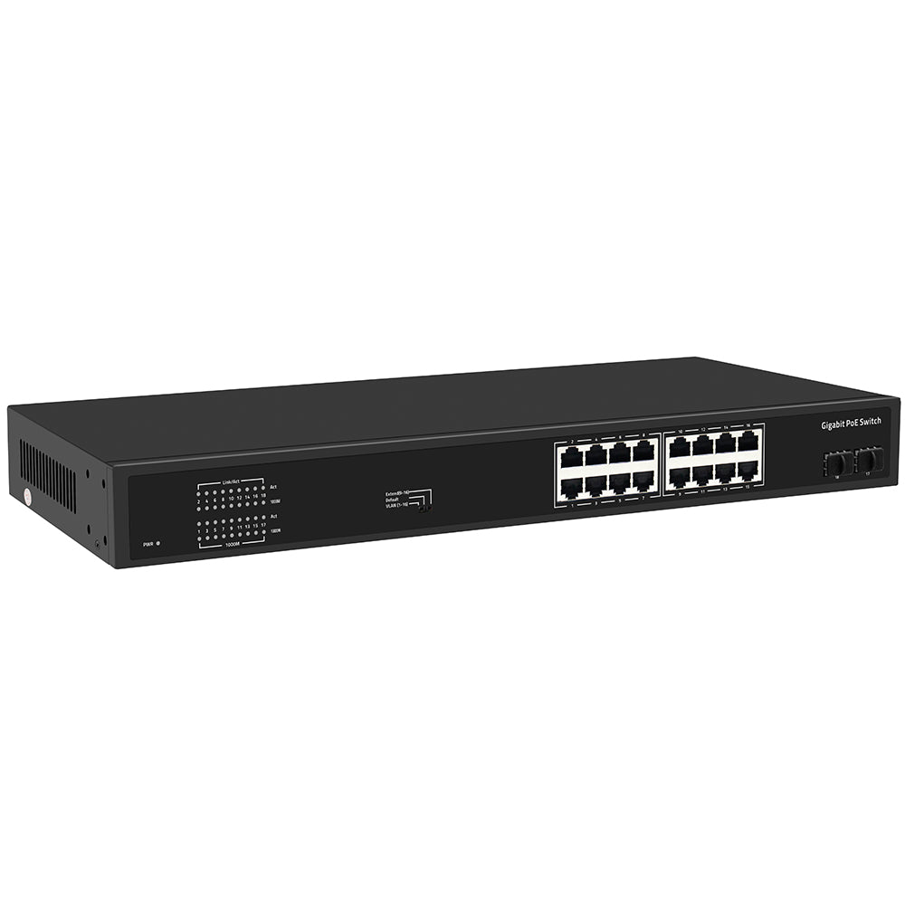 16× Gigabit PoE ports + 2× Gigabit SFP uplink ports for hybrid fiber-copper networking