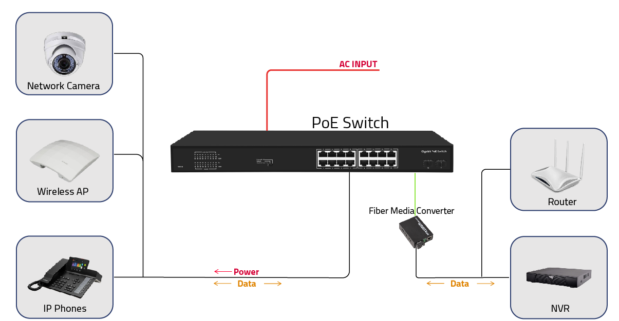 - CCTV & Security Systems: Supplying power and data to IP cameras, NVRs, and video management platforms over extended distances